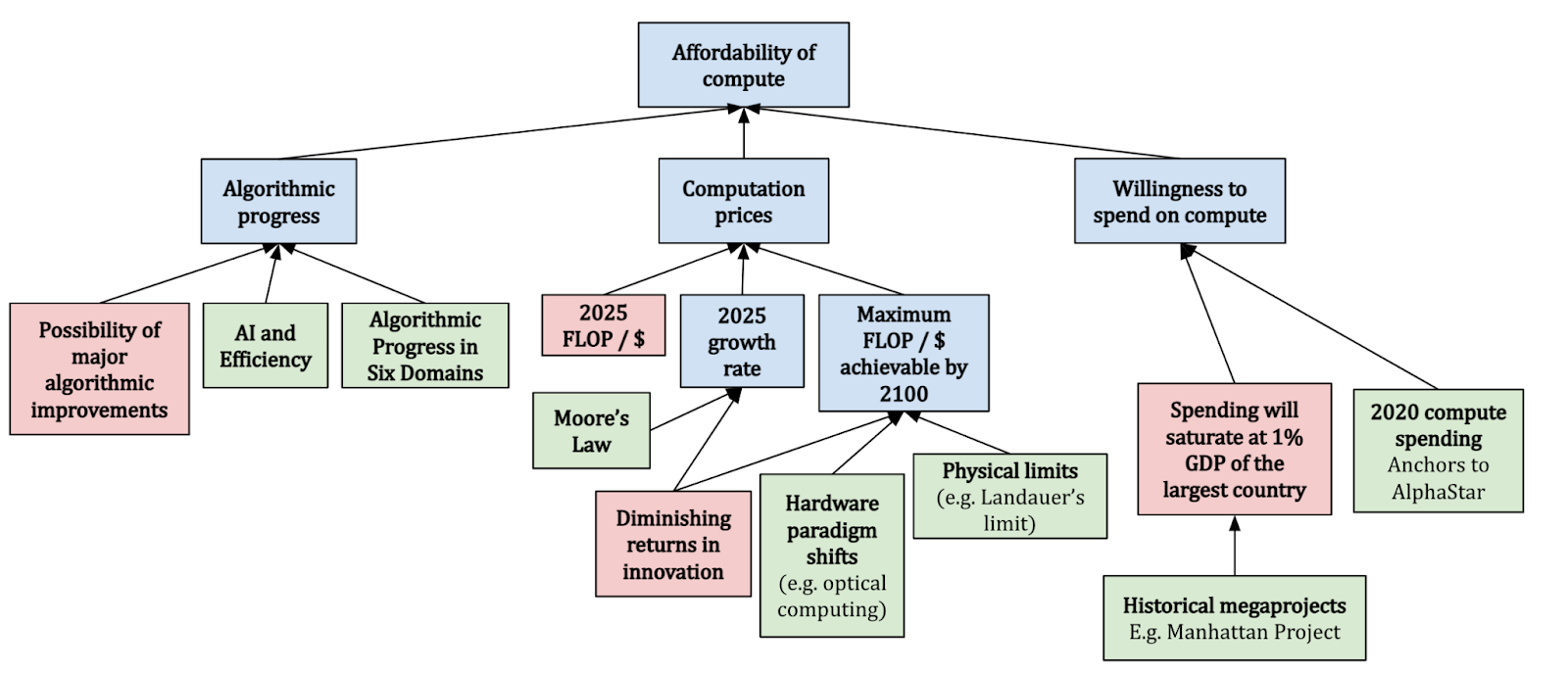 After using the bioanchors to determine a distribution for the compute FLOP required to build TAI using 2020 algorithms and architectures, Cotra turns to find a probability distribution over whether or not we’ll be able to afford this compute. She does this by considering three different factors: