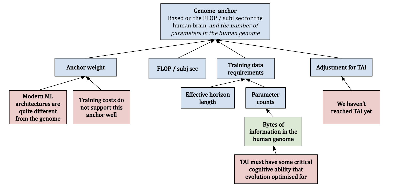The genome anchor looks at the FLOP / subj sec of the human brain, and expects TAI to require as many parameters as there are bytes in the human genome. This hypothesis implicitly assumes a training process that’s structurally analogous to evolution[12], and that TAI will have some critical cognitive ability that evolution optimised for.
