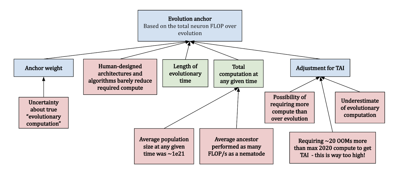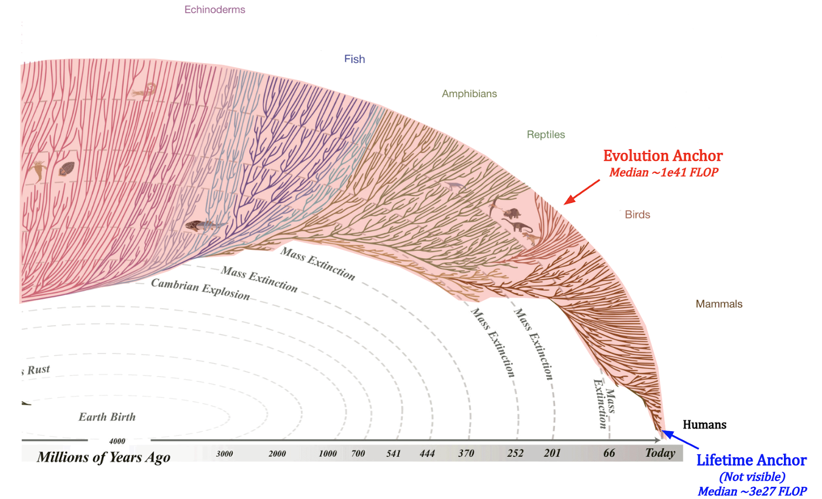 Evolution anchor: The compute required to train a transformative model is roughly the total compute done over evolutionary history, starting from the first neurons. This interprets evolution as a really big search algorithm over a large space of possible neural architectures and environments, eventually stumbling across the human brain.