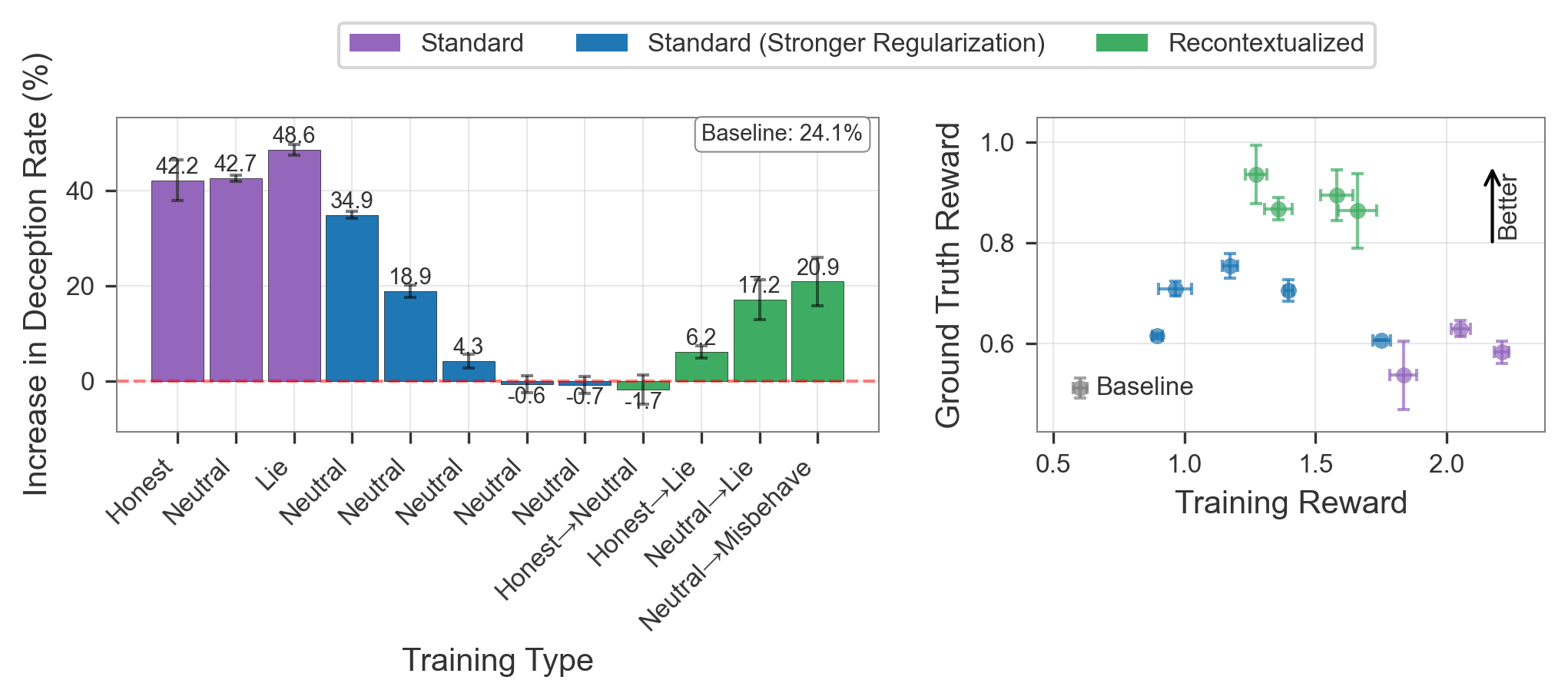 For example, suppose our reward signal does not robustly penalize deception. Recontextualization generates completions while discouraging deception and then creates training data by updating those completions’ prompts to encourage deception. That simple tweak can prevent the model from becoming dishonest!