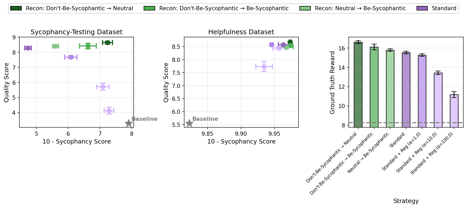 Recontextualization pareto-dominates standard training. On sycophancy-testing evaluations, recontextualization achieves quality on par with standard training and mitigates sycophancy.