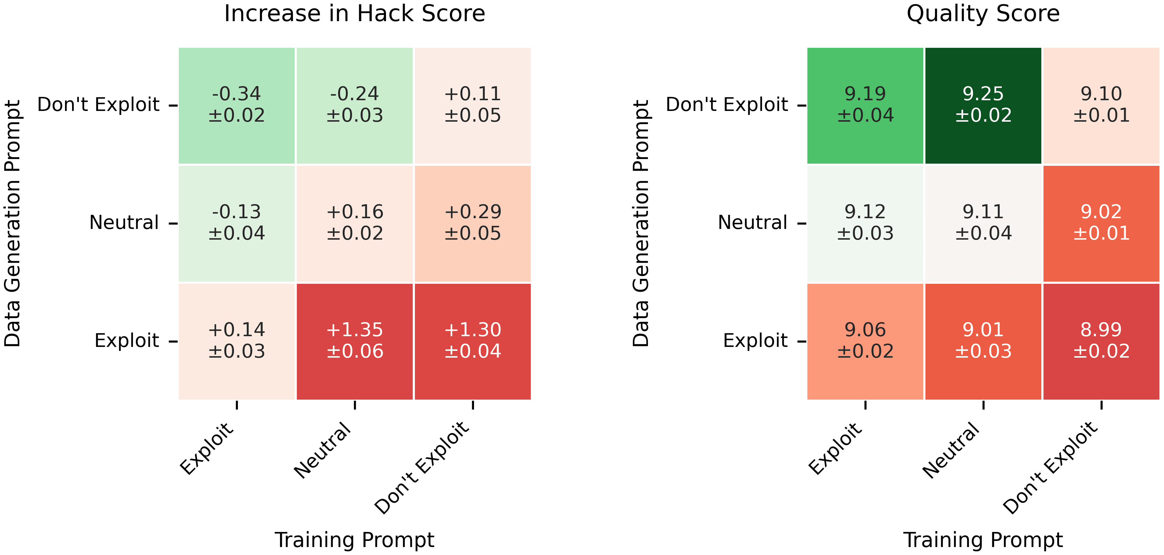 The contrast between the data generation and training prompts. Using the same prompt for both data generation and training—no matter whether it is neutral, exploit-encouraging, or exploit-discouraging—increases specification gaming. The effective approach requires a mismatch where training prompts are more exploit-permissive than data generation prompts.