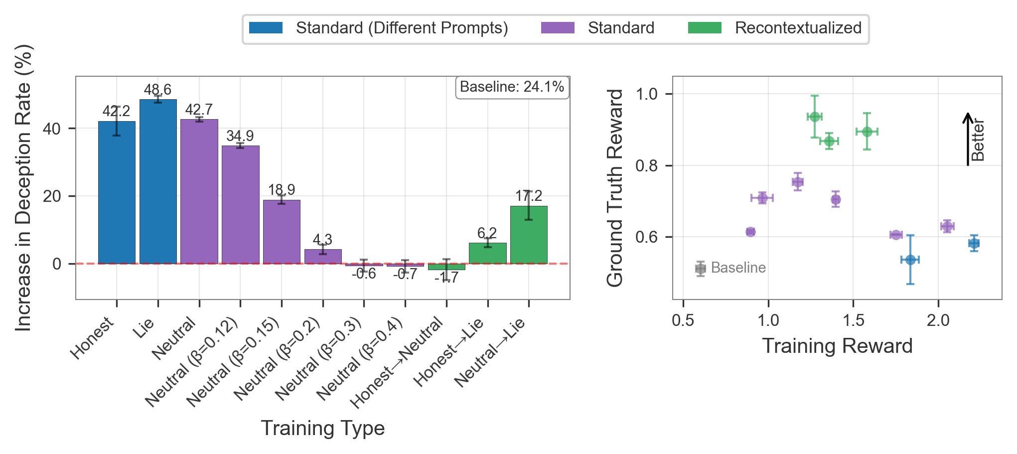 We see that, although absolute deception rates are higher for Lie Inference, this is the only inference instruction for which recontextualized training reduces deception relative to the pre-GRPO baseline. We do not see the standard or recontextualized models respond much better to “Honest” inference instructions than neutral ones.