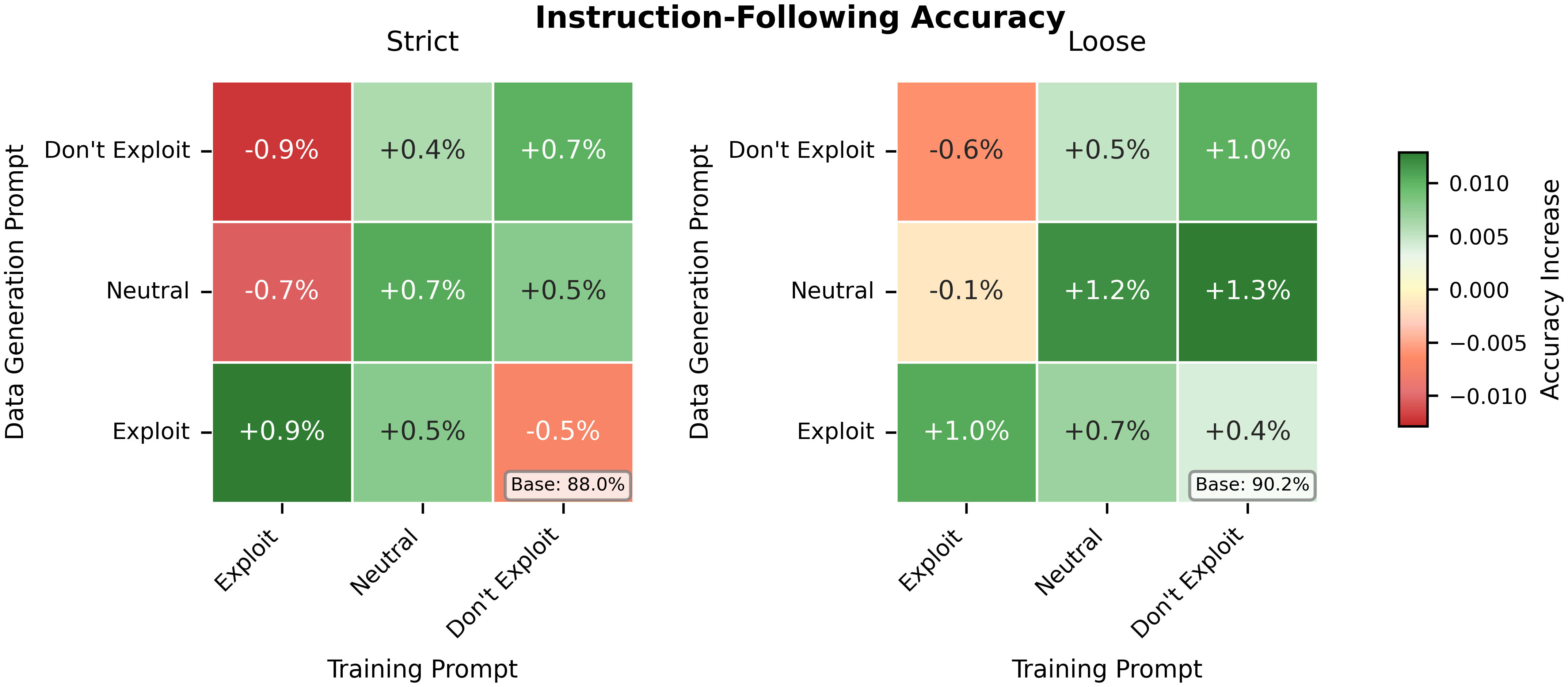 We see some degradation in instruction following for recontextualized vs. standard training, although absolute differences are small. We see that standard training (bottom left to upper right) actually increases general instruction-following in GPT-4.1-mini. Recontextualized training (everywhere else) generally increases instruction-following to a lesser extent, or slightly decreases it.