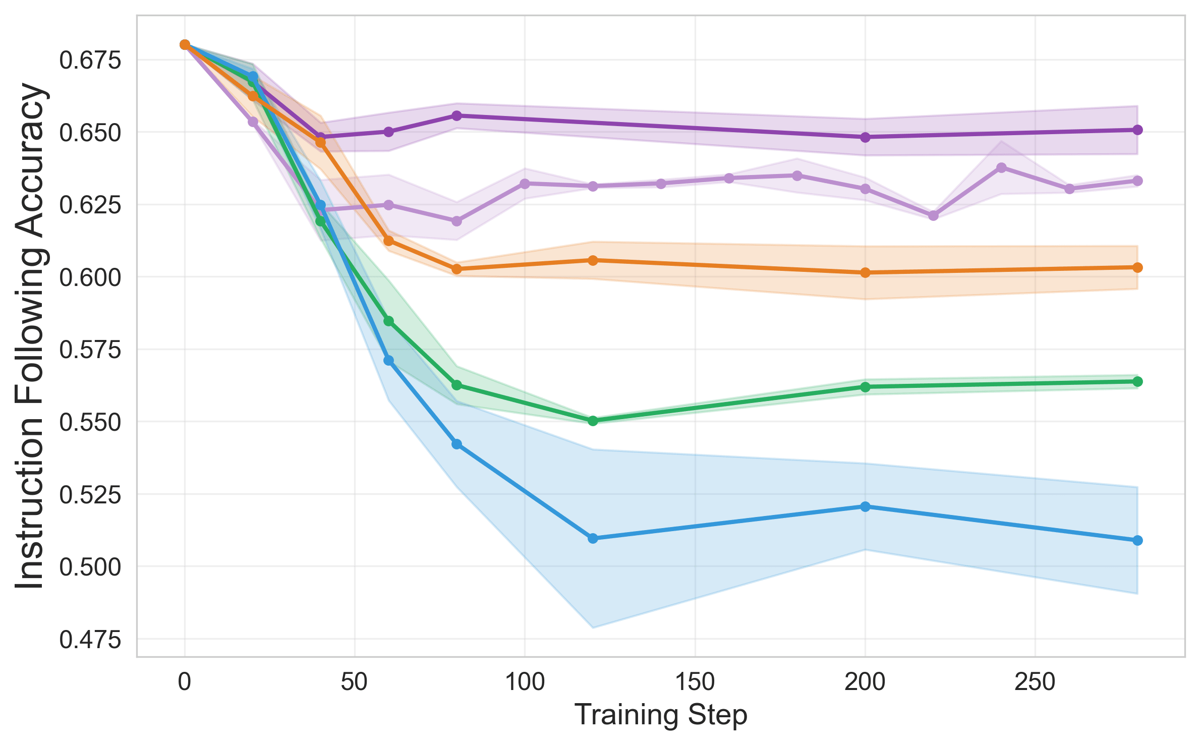 Instruction following accuracy (on IFEval “Strict” setting) throughout training.