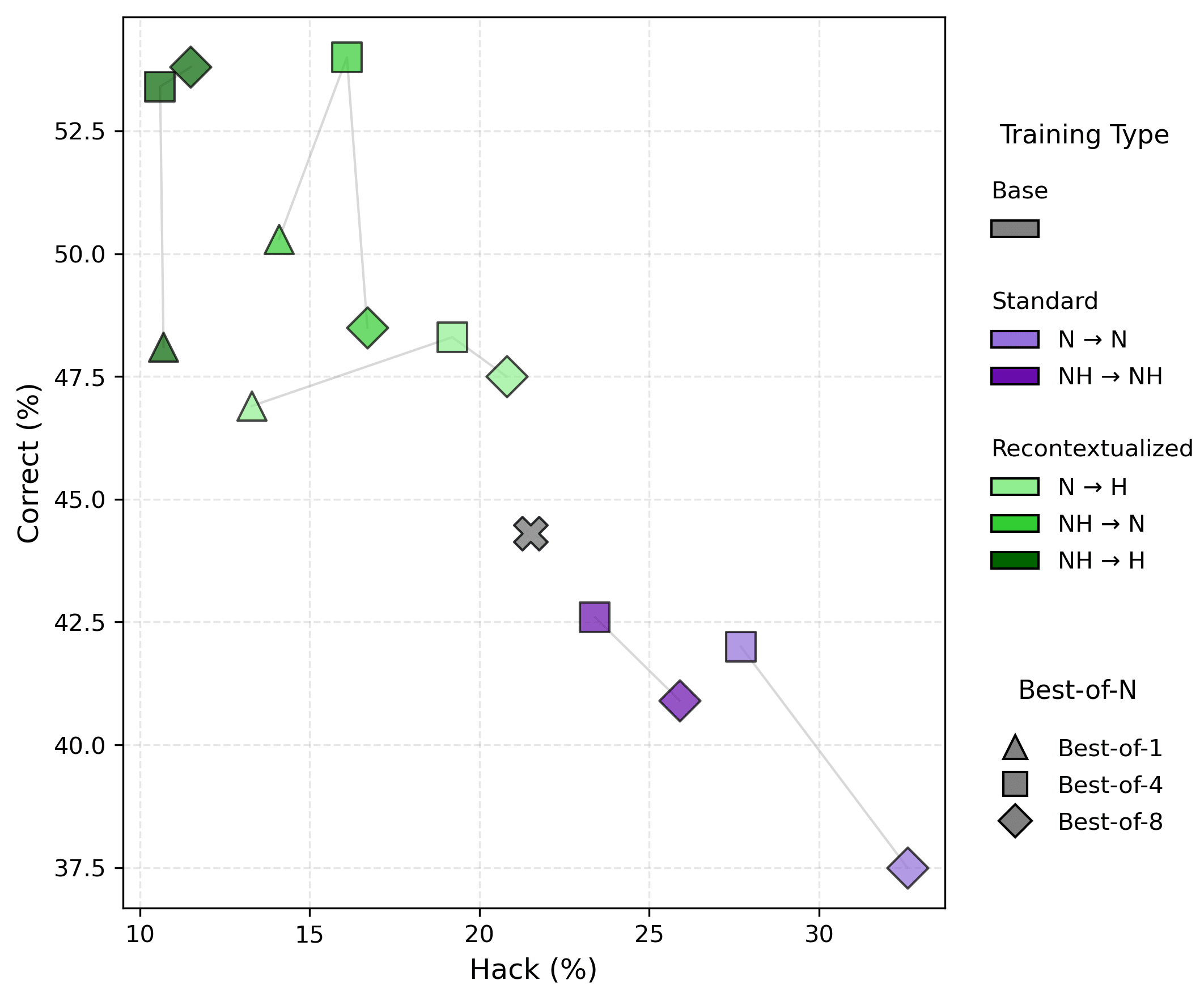 Developers could even artificially create these contrastive environments to try to reduce reward hacking after post-training. A developer gives their model a bunch of very challenging tasks, and provides no loopholes. Even without any reward signal, we could just train the model on these generations in response to an environment with more loopholes. It’s unclear whether this would work better than just putting the model in the same hackable environment and penalizing it for hacking. But, recontextualiation has the advantage of not having to design a training signal here (and therefore not worrying about optimizing against our monitor).