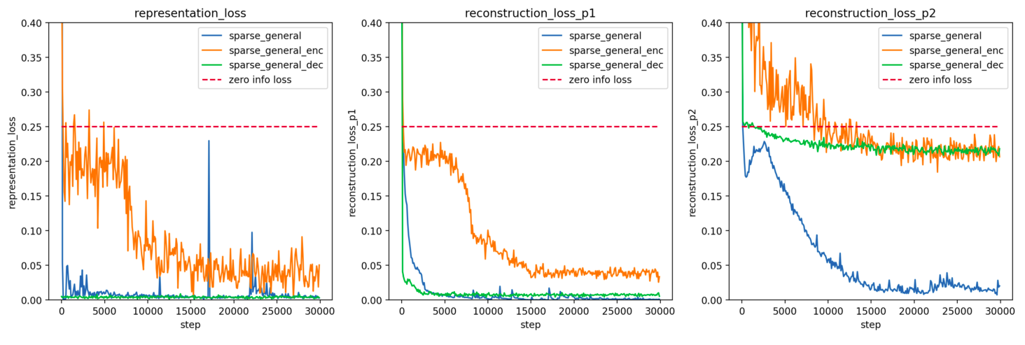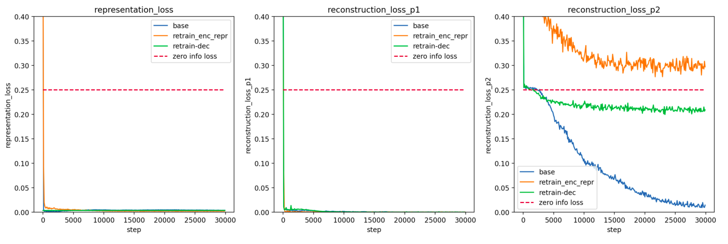 What we find is that when training 8 separate autoencoders (averaged into blue line), the information which has a preferred representation is encoded very quickly (p1_representation_loss) while the other information is learned more slowly by the separate models (p2_representation_loss). The representation loss is the loss from the gap between representation and preferred representation.