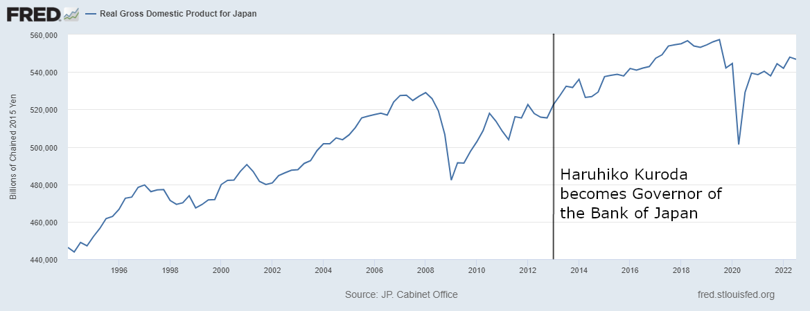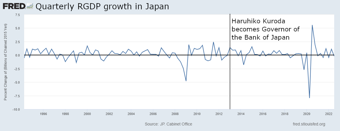 According to official government data, Japan’s RGDP had not been falling prior to 2013, other than the fall caused by the Great Recession. RGDP did grow by ~2.0% in 2013, but I cannot discern any significant change in the trend after Haruhiko Kuroda began serving as governor at the Bank of Japan.