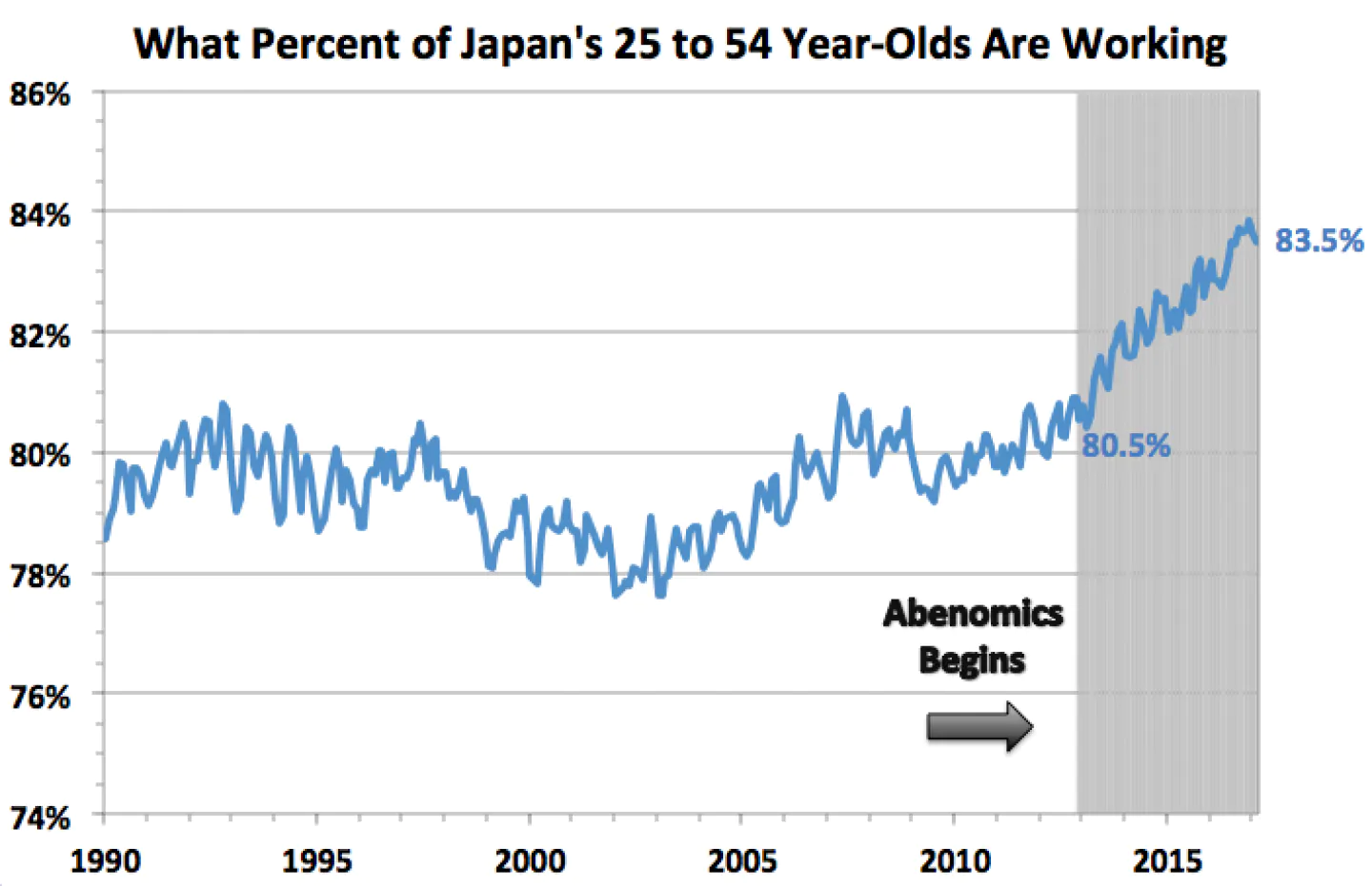 The only data series presented in the article is this plot of the prime age labor force participation rate. However, the effect looks kind of weak to me, and I don’t think raising prime age LFPR is a standard target of monetary policy. (For example, the Bank of Japan had a webpage called “Outline of Monetary Policy” from the time the article was published, and it focused solely on the goal of price stability at 2% inflation, and didn’t mention employment levels.)