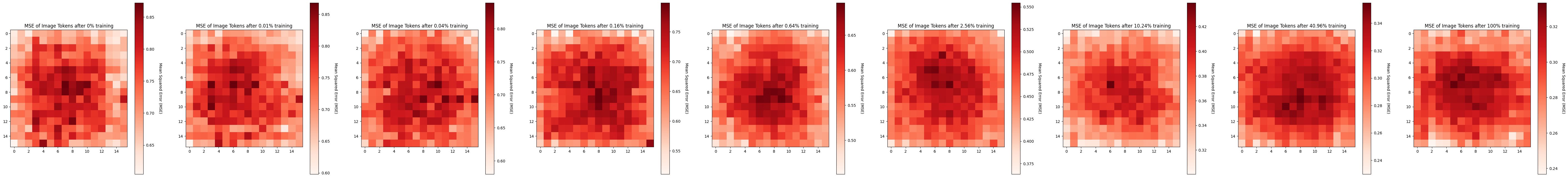 All layers were trained across all 257 image patches. Below we provide plots demonstrating the reconstruction MSE for each token (other than the CLS token) as training progressed. It seems that throughout training the outer tokens are easier to reconstruct than those in the middle, presumably because these tokens capture more important information (i.e. foreground objects) and are therefore more information rich.