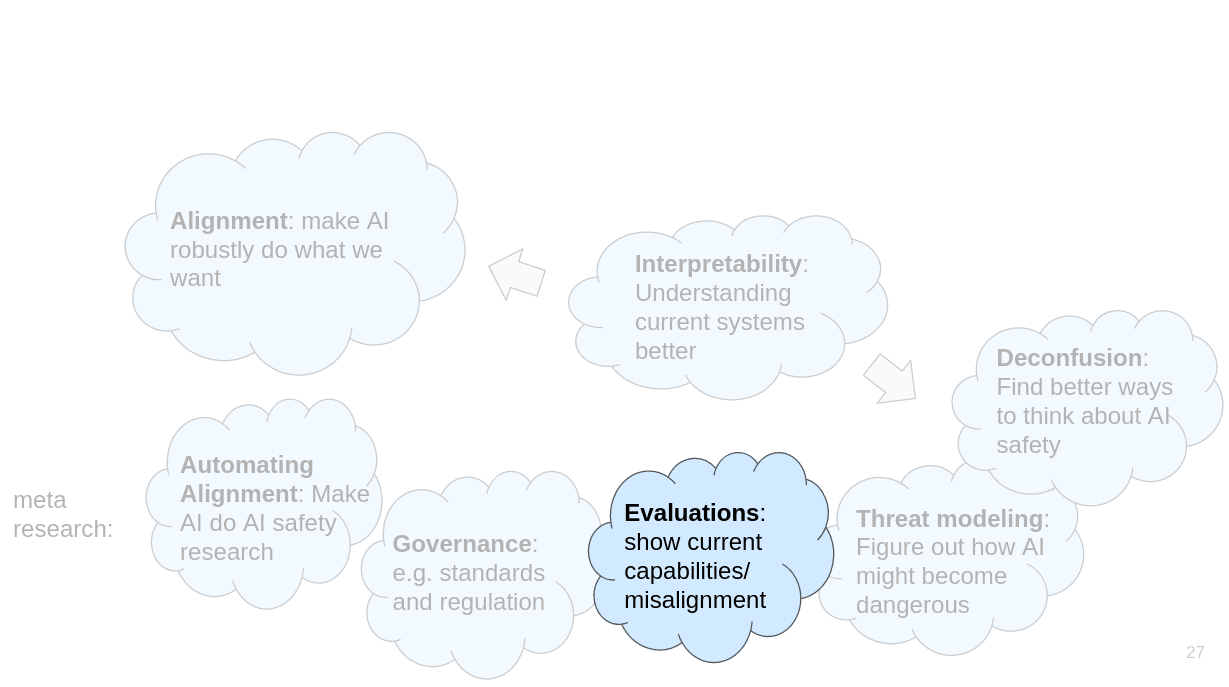 The first category of research is what I would just call alignment, which is about making AIs robustly do what we want. Then there are various “meta” research directions such as automating alignment, governance, evaluations, threat modeling and deconfusion. And there is interpretability. Interpretability is probably not enough to build safe AI on its own, but it’s really helpful/probably necessary for various alignment proposals. Interpretability also helps with deconfusion.