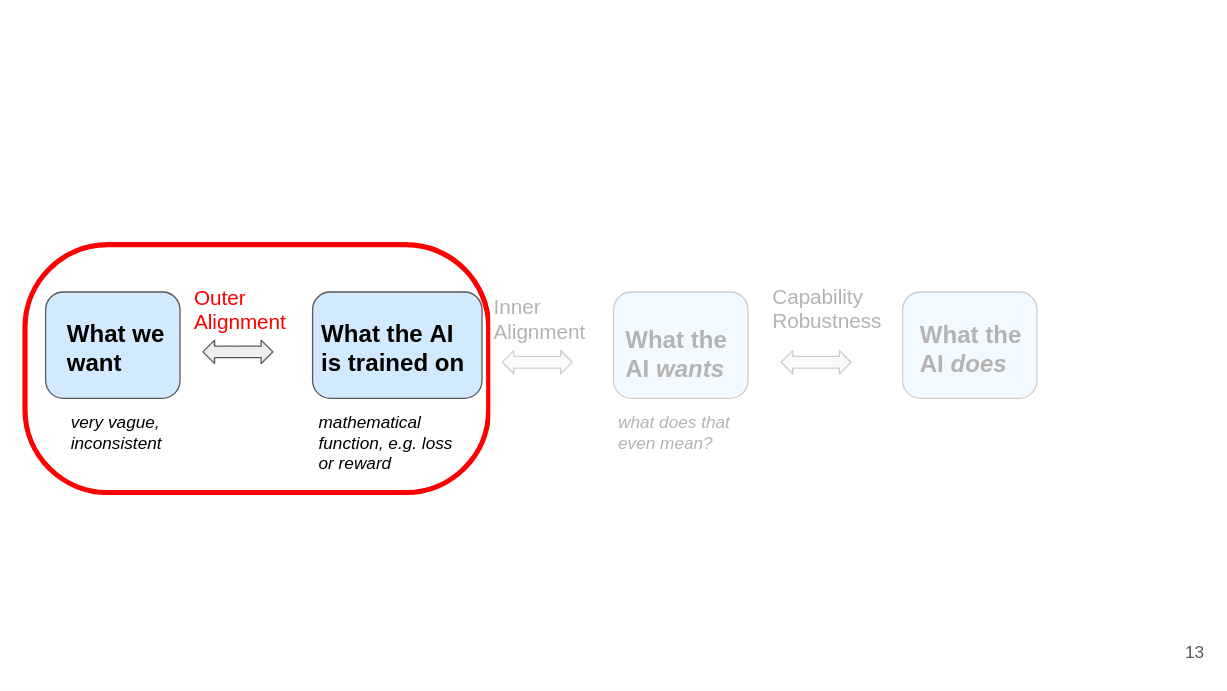 And we can split intent alignment up into outer alignment (find a function that captures what we want) and inner alignment (ensure that what the AI ends up wanting is the same as what’s specified in the function that we trained it on).