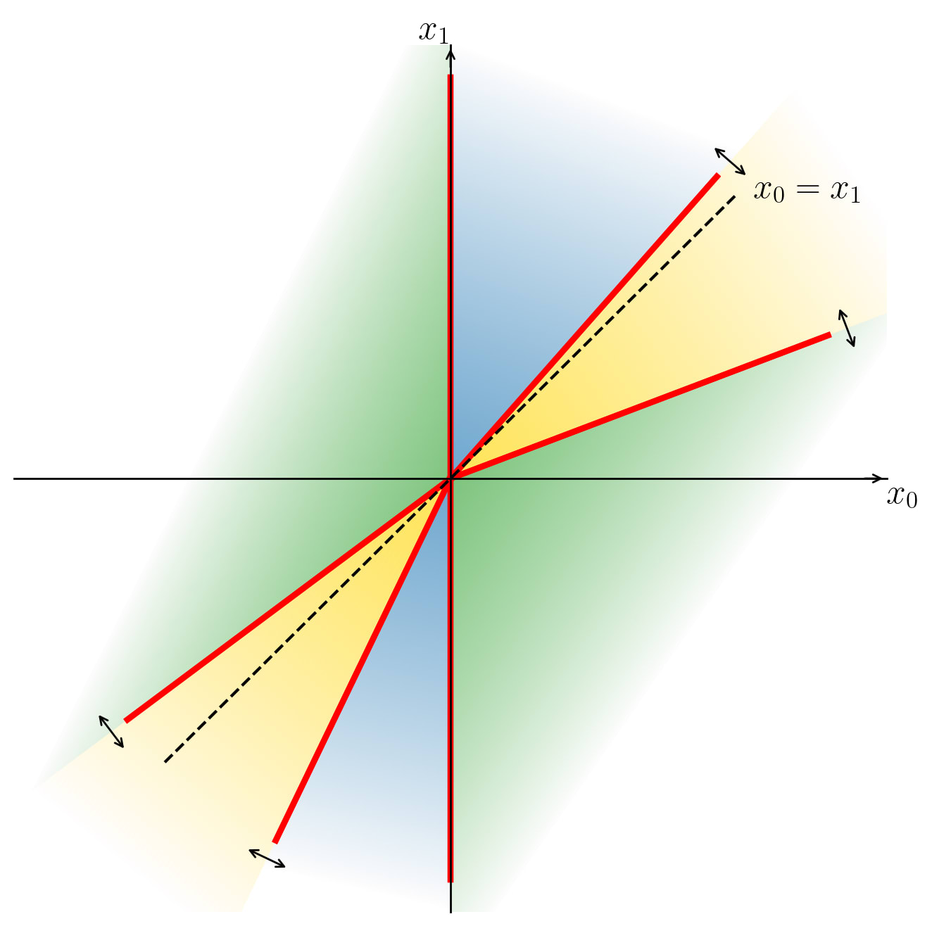 Here, a double arrow indicates that a boundary lies somewhere between its neighboring axis and the dashed line , but we don’t need to worry about exactly where it lies within this range.