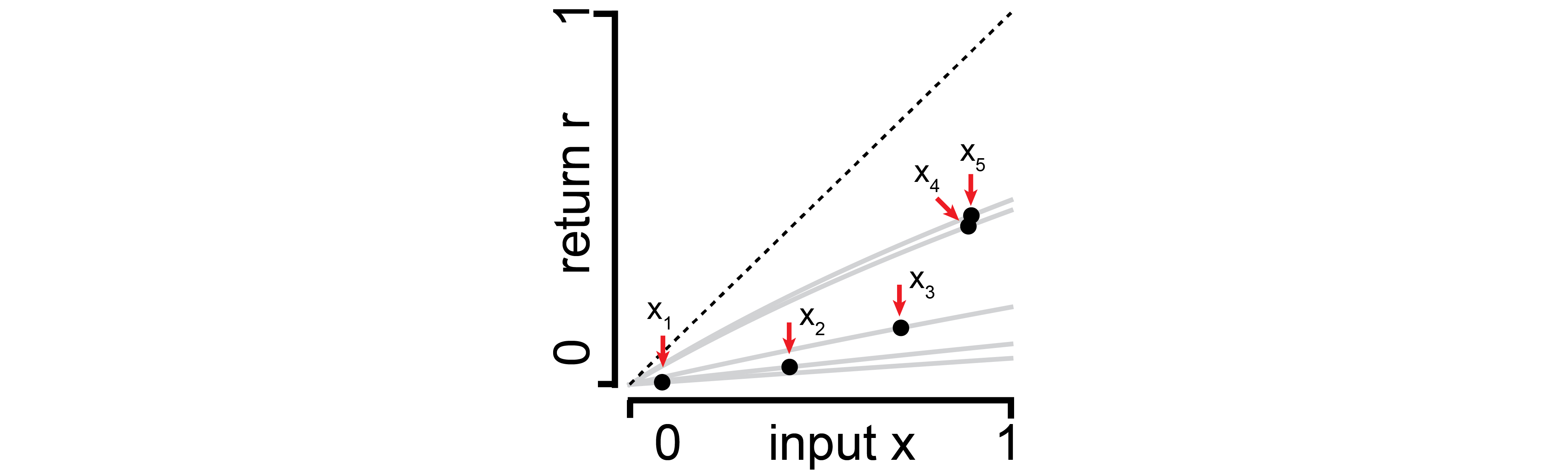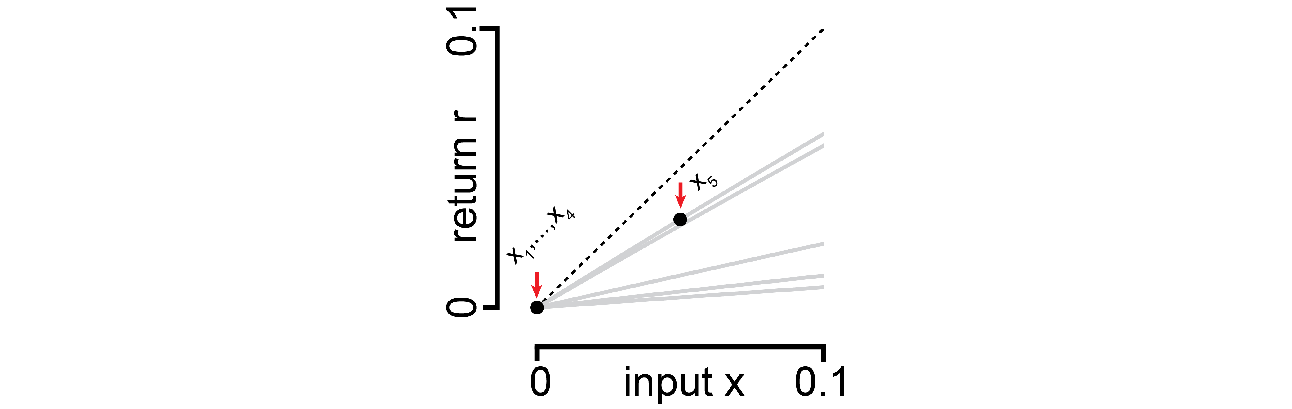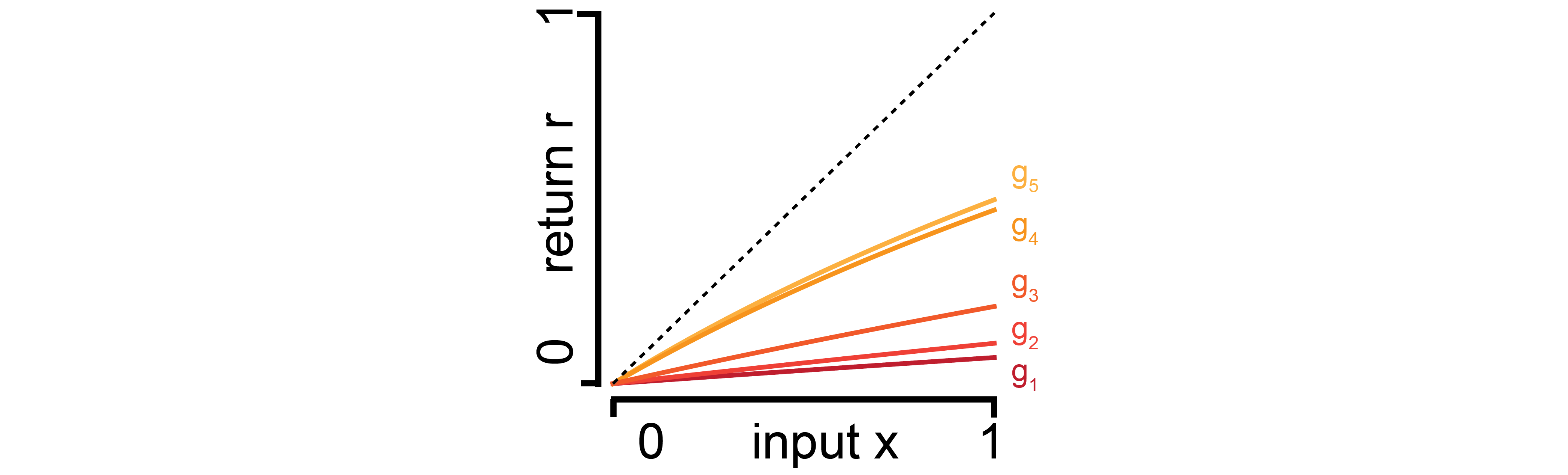 | Expected return as a function of income. Different colored lines indicate different opportunities with different scaling factors “a”. The dashed line indicates the identity. Code is here. |