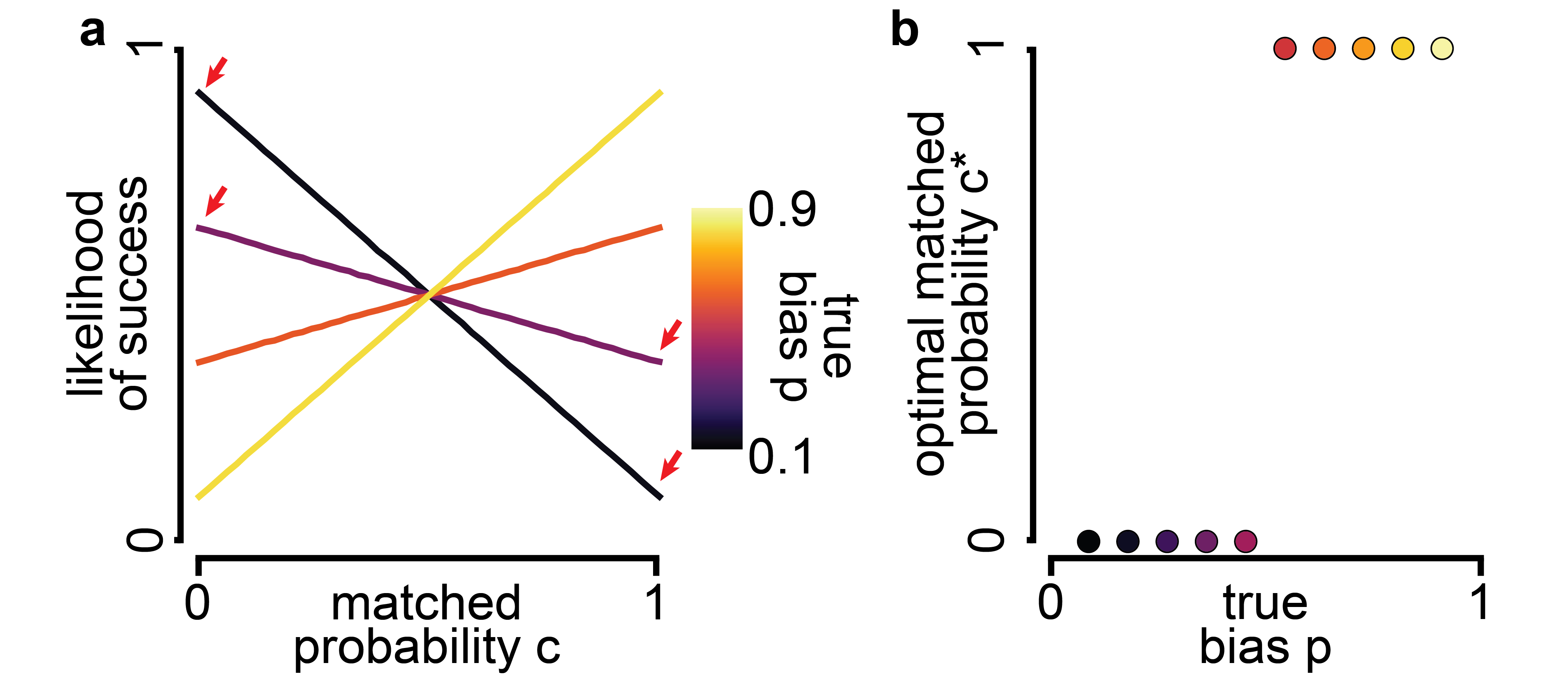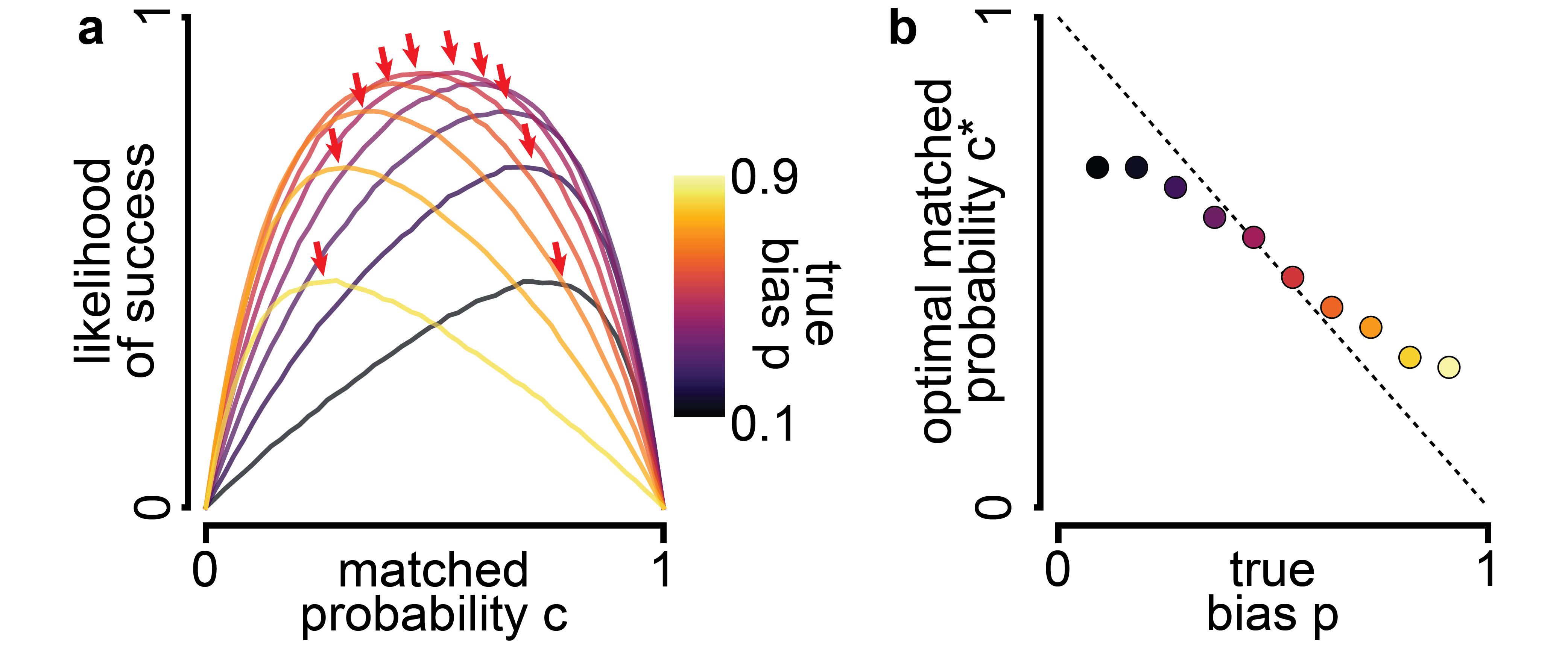 | (a) Likelihood of success (fraction of trials where you guess correctly) as a function of the matched probability (fraction of trials where you pick source one). Different colors denote different “true biases” (the actual fraction of trials where the reward is at source one). Red arrows indicate the optimal choice of matched probability for different underlying true biases. (b) Optimal matched probabilities (red arrows in panel a) as a function of the true bias. Code is here. |