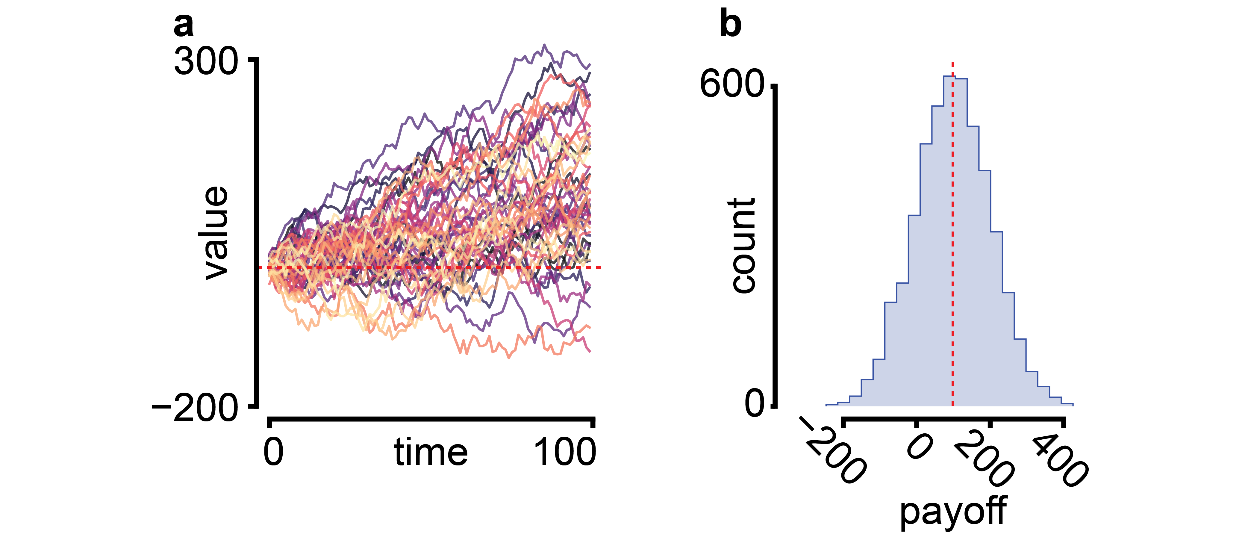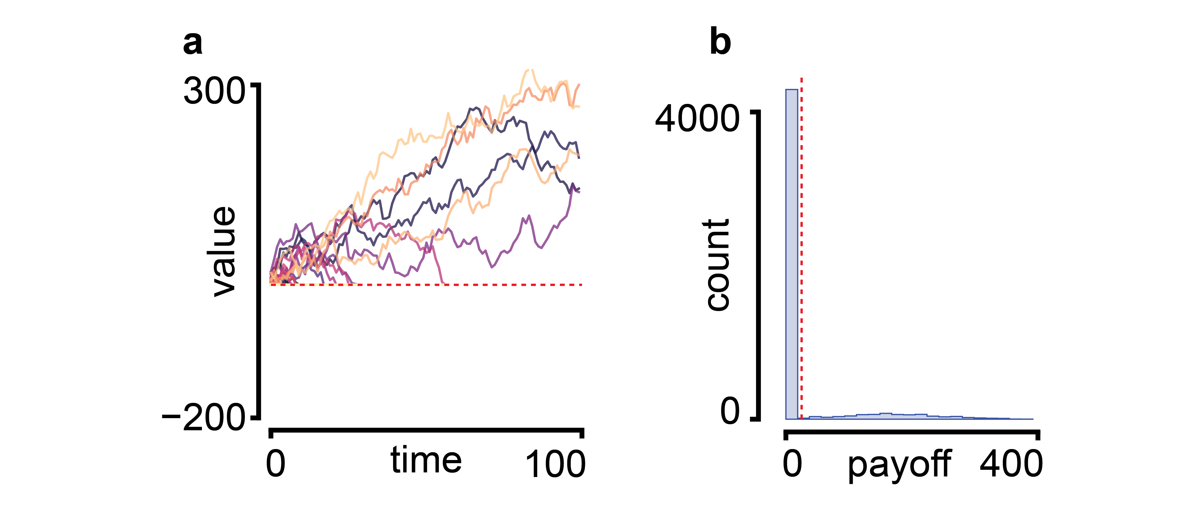 | (a) Value of the opportunity as a function of time. Multiple equally distributed time series are shown. The dashed line in red indicates zero value. (b) Histogram plot of payoffs (value of opportunity at time point 100). The dashed line in red indicates average payoff. Code is here. |
