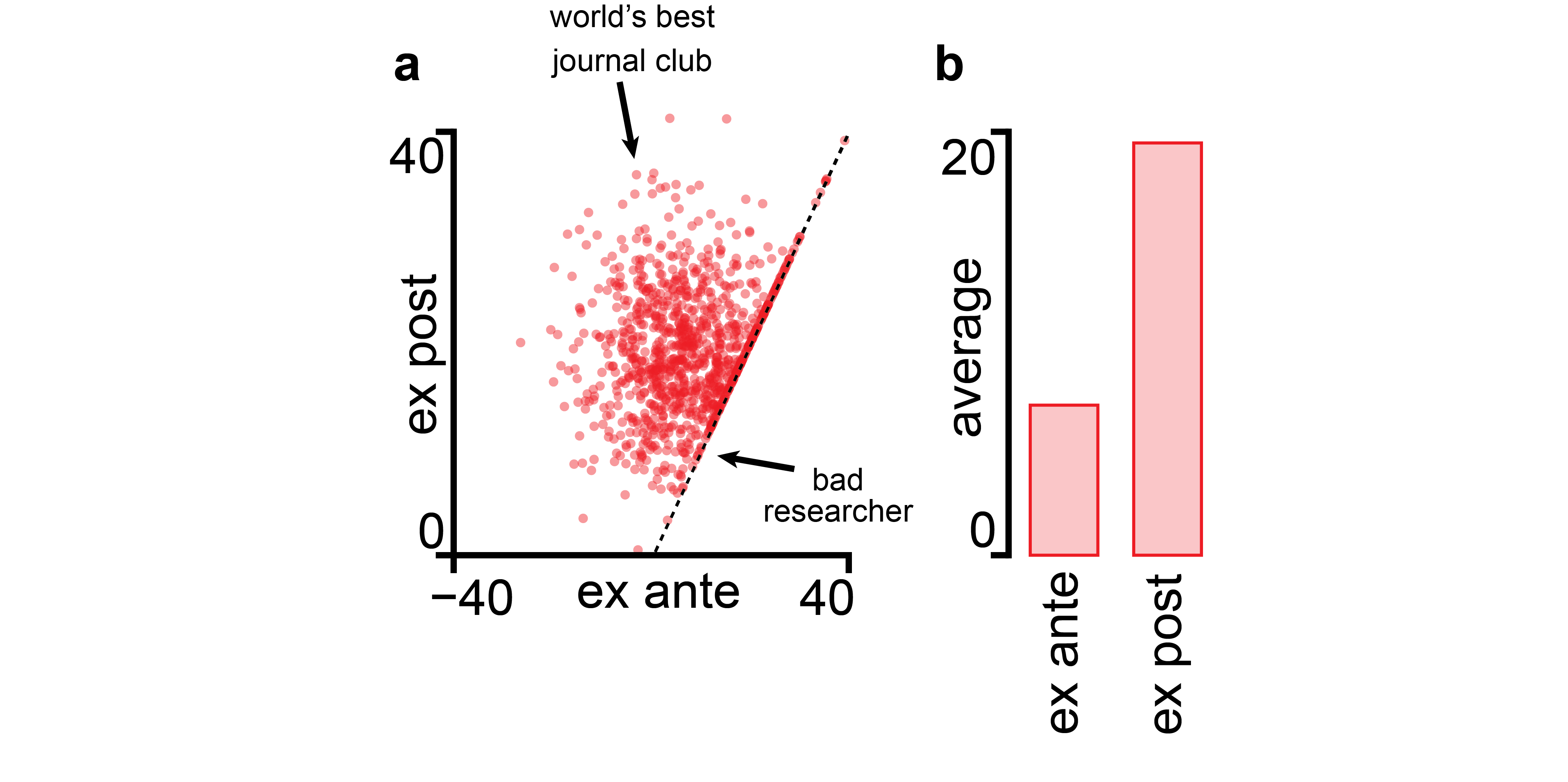 | (a) Ex-post outcome (do all the things and pick the thing that worked best) compared with ex-ante outcome (only do the one thing with the highest expected value. (b) Average ex-ante and ex-post outcomes. Code is here. |