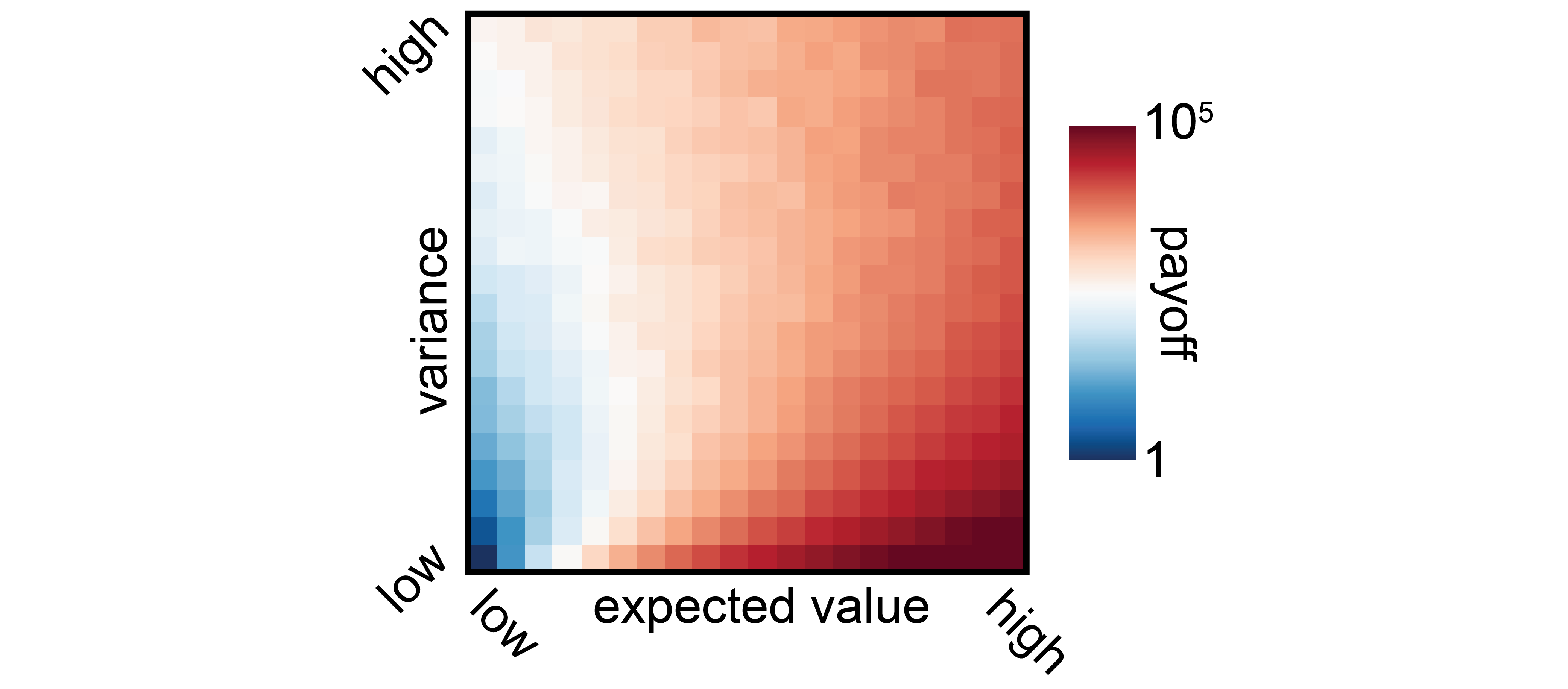 | Expected payoff for different combinations of expected value and variance of the driving noise process. Colorbar is on a log scale. Note how a medium-sized expected value with low variance might result in a higher payoff compared to a high expected value with high variance. |