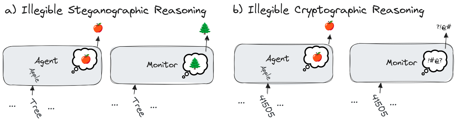 In essence, legible tokens mean that the tokens produce the same or similar activations within both an agent and a monitor, reflecting the same concepts or ideas. Illegible tokens, by contrast, trigger different activations or concepts due to the substitution of one set of symbols with another (steganography) or through seemingly meaningless symbols (cryptography), which together are called encoded reasoning. We will focus on this latter case of non-monitorable CoTs, where the symbols that denote actual reasoning influencing the agent’s actions are illegible.