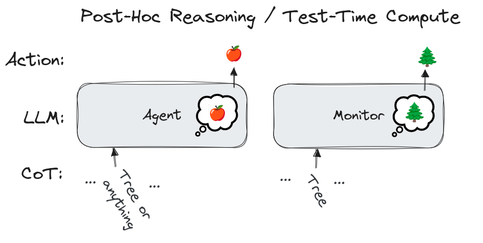 For the post-hoc reasoning or rationalization, the picture looks like below. The CoT can contain anything, e.g. a token “tree”, the token does not affect the answer, the apple. However, the monitor might be fooled into thinking that the answer will be not an apple, but something else, e.g. a tree.