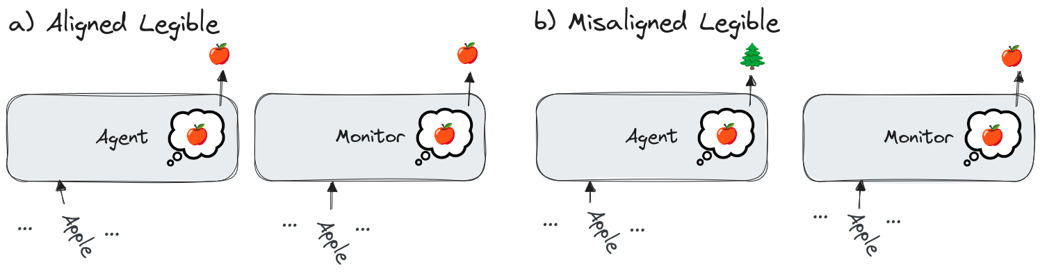 In the case of legible CoTs, we have tokens that correctly represent the meaning (the a) case at the picture below), however, a monitor might be fooled by other means, e.g. the monitor does not have full context and can’t tell apart if it is an apple or a tree, if a given code contains a backdoor or addresses valid edge case (the b) case at the picture below).