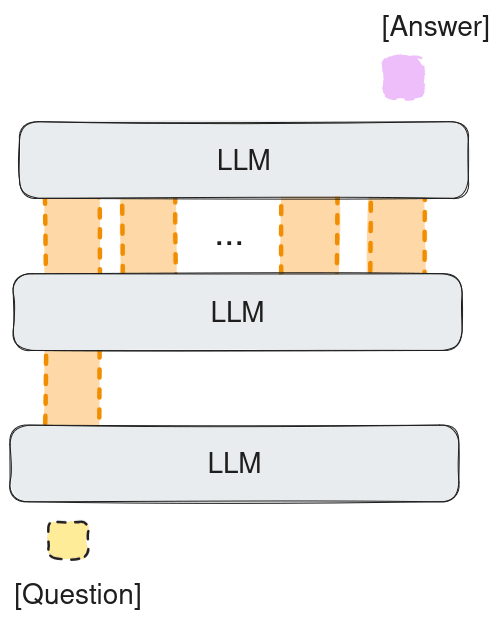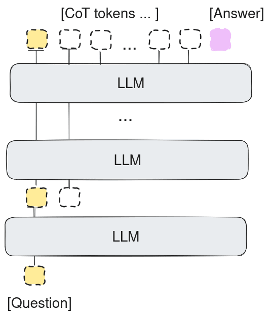 As you see the model does not map hidden states in the intermediate computation space to tokens but only the final answer. Another way of looking at it is if we stack the autoregressive calls to the LLM as at the image below. The image shows autoregressive calls to one LLM without the mapping to tokens (in orange), given the question (in yellow), to compute the answer (in pink):
