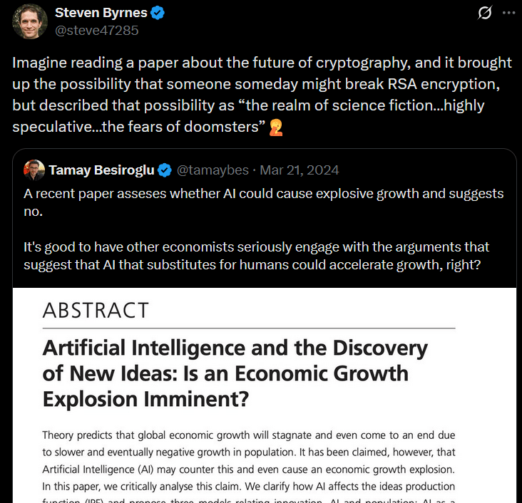 …Since actual AGI is so foreign to economists’ worldviews, they often deny the premise. E.g. here’s Tyler Cowen demonstrating a complete lack of understanding of what we doomers are talking about, when we talk about future powerful AI.