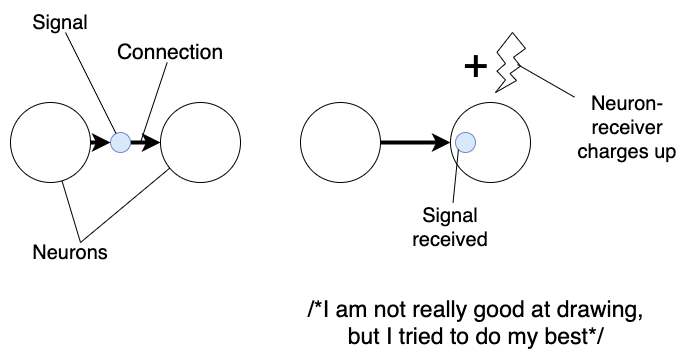 Inside the brain, we have neurons. There are different types of them and several types of mediators. We don’t care about them right now. We will use a simple model, where each neuron connects to others. While receiving input signals, it charges up.