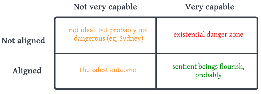 While the notion of a negative alignment tax is fairly speculative and optimistic, we think the theoretical case for it being a desirable and pragmatic outcome is straightforward given the current state of the board.[6] Whether we like it or not, humanity’s current-and-seemingly-highly-stable incentive structures have us hurtling towards ever-more-capable AI without any corresponding guarantees regarding safety. We think that an underrated general strategy for contending with this reality is for researchers—and alignment startup founders—to further explore neglected alignment approaches with negative alignment taxes.