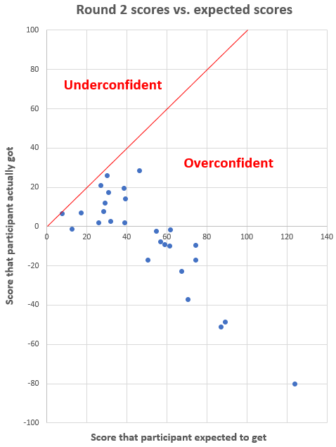 Figure 4: overconfidence in Round 2. Distance from the red line roughly corresponds to amount of overconfidence.