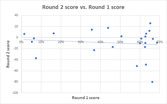Figure 6: Round 2 score versus amount of overconfidence (measured by optimal amount of squeezing toward 50%)
