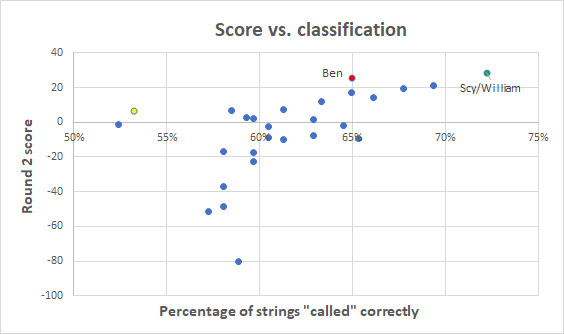 One rudimentary measure of classification is what fraction of strings were “called” correctly. That is, one could look at how well contestants would have done if I had simply awarded each contestant a point for every real string to which they assigned a probability greater than 50% and every fake string to which they assigned a probability less than 50% (and half a point if they said 50%). Here’s a plot of contestant scores vs. the fraction of strings they called correctly.