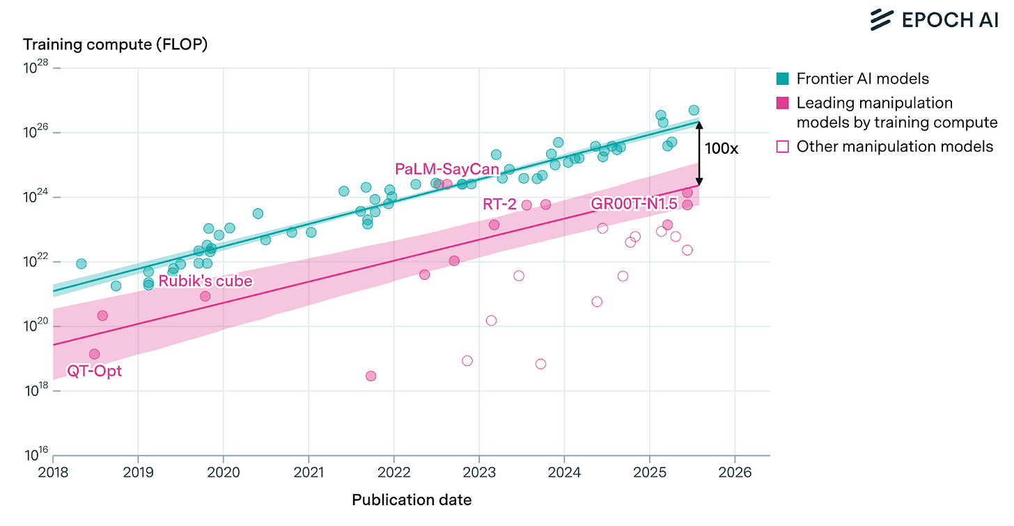 With the data bottleneck unlocked, much of the robotics progress has been made with foundation models rapidly scaling up due to the 100x compute overhang created by language models. Over the course of a year robotics foundation models basically close this gap entirely, so parameter counts, context lengths and data have all seen a huge one-time jump in the past year.