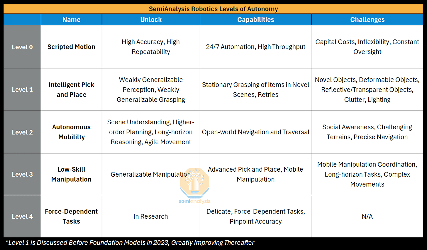 In 2025, the robotics autonomy levels of autonomy had reached ubiquitous deployment of scripted motion (level 0) robots in factory floors. Intelligent pick and place robots (level 1) were rolling out in places like Amazon’s warehouses. Autonomous mobility robots (level 2) had seen some very impressive prototypes, and low skill manipulation robots (level 3) were also starting to see some impressive demos (like laundry folding and doing dishes) but these were pretty cherry-picked (specific, short tasks) so this domain was still largely in R&D. Finally higher skill robots for force-dependent tasks (level 4) like plumbing, or electrician tasks, were very far away on the horizon.