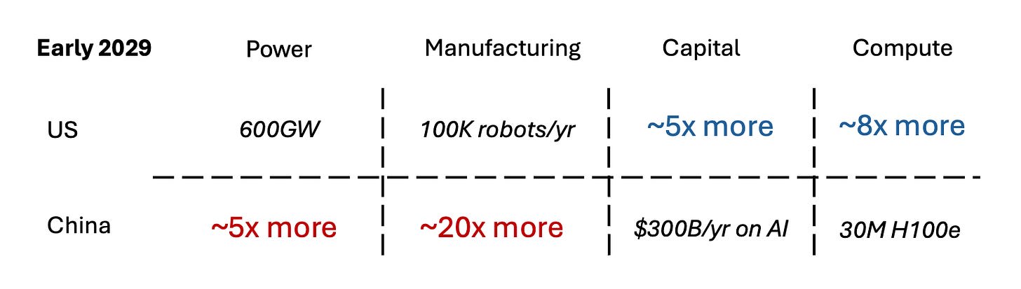 Interesting read, however I am a bit surprised by how you treat power, with US at 600GW and China 5* more. Similar things are often quoted in mainstream media and I think they are missing the point. Power seems to be relevant only in terms of supplying AI compute, and possibly robotics, and only then IF it is a constraint.