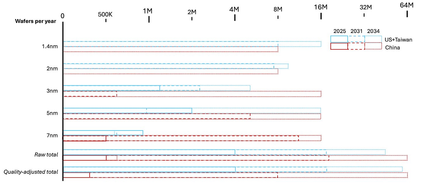 With the benefit of being able to pull apart ASML DUV machines, hiring former employees of ASML and its suppliers, “knowing the golden path,” multiple public accounts of cyberattacks (2023, 2025), and the more recent spending boost, China is now moving through the lithography tech tree twice as fast as ASML did. ASML only spent around $30B (inflation adjusted) on R&D in total from 2000 through 2024, and around 300,000 employee-years. There are now 2 separate lithography efforts in China each spending north of $10B/yr with about 10,000 employees. So by 2027, they have reached the milestone of mass production with 7nm-capable DUV machines, around 13 years behind ASML. At this pace, they are on track for 5-nm capable EUV in 4 years.