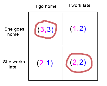 Suppose my girlfriend and I have both lost our cell phones and cannot contact each other. Both of us would really like to spend more time at home with each other (utility 3). But both of us also have a slight preference in favor of working late and earning some overtime (utility 2). If I go home and my girlfriend’s there and I can spend time with her, great. If I stay at work and make some money, that would be pretty okay too. But if I go home and my girlfriend’s not there and I have to sit around alone all night, that would be the worst possible outcome (utility 1). Meanwhile, my girlfriend has the same set of preferences: she wants to spend time with me, she’d be okay with working late, but she doesn’t want to sit at home alone.
