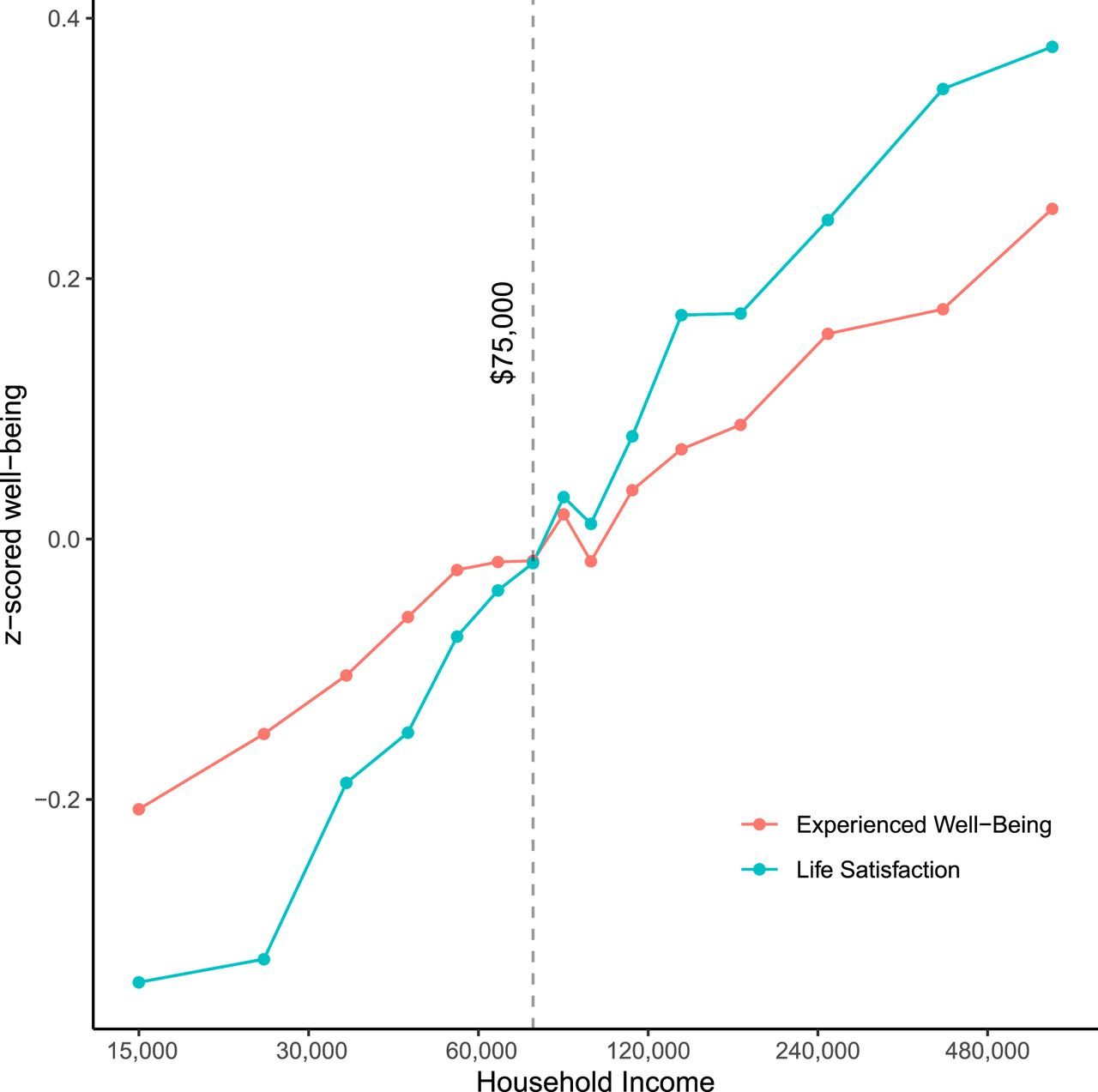 Perhaps $75,000 is a threshold beyond which further increases in income no longer improve individuals’ ability to do what matters most to their emotional well-being, such as spending time with people they like, avoiding pain and disease, and enjoying leisure.