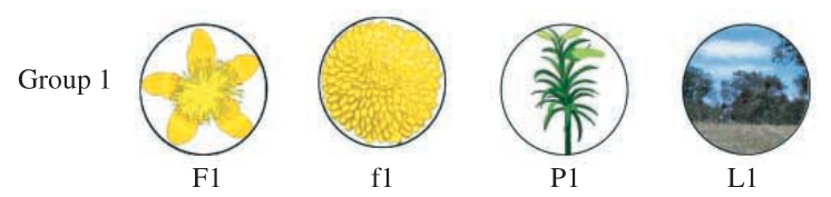 Training consisted of showing bees sample images and rewarding them by landing on the matching image, as mentioned previously. The training set (called “Group 1” in the paper), with one image of every category (star-shaped flowers, circular flowers, plant stems, and landscapes), is shown below.