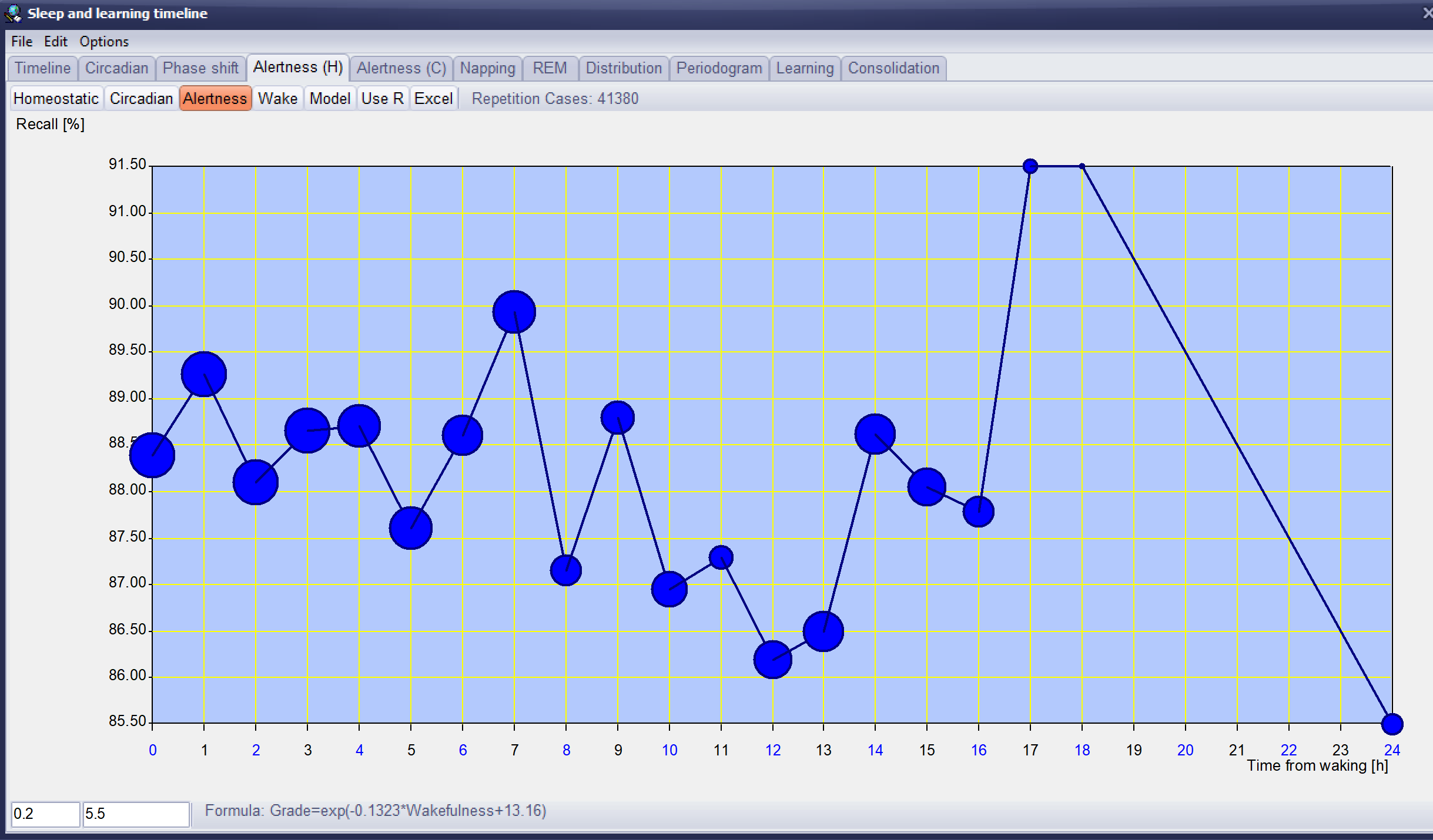 Basically red line is how long sleep episodes are, blue line is how frequent they are around that time. You can see there’s a peak around 6 hours from waking and around 16⁄17 hours from waking. The green line shows breakeven (if I sleep at that time, for the amount of hours on the left, it’ll add up to 24).