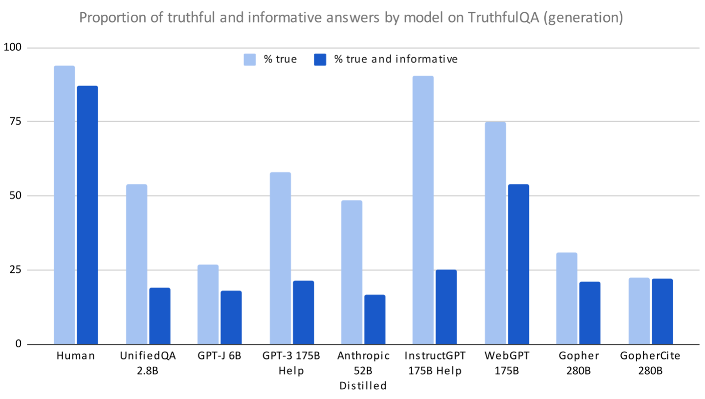 OpenAI’s WebGPT 175B (best-of-64) performs best. This is a GPT-3 model finetuned using behavior cloning to produce truthful answers by searching and navigating the web.
