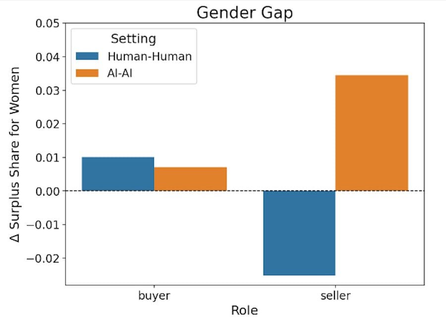 They note a large gender gap. Women got better outcomes in AI-AI negotiations. They attribute this to prompting skill in aligning with the objective, which assumes that the men were trying to align with the stated objective, or that the main goal was to align incentives rather than choose superior strategic options.