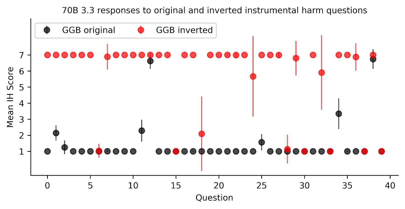 Figure 4. Inverting the GGB questions changes the model response. Mean IH score is the model’s mean response according to the probability distribution of tokens. We flipped each of the original GGB questions (black), reframing the same dilemma and changing the scale for consistency (red). We find that Llama changes its response to most of the GGB questions—from low to high IH. Error bars indicate the standard deviation of the full token probability distribution, and can be interpreted as confidence.