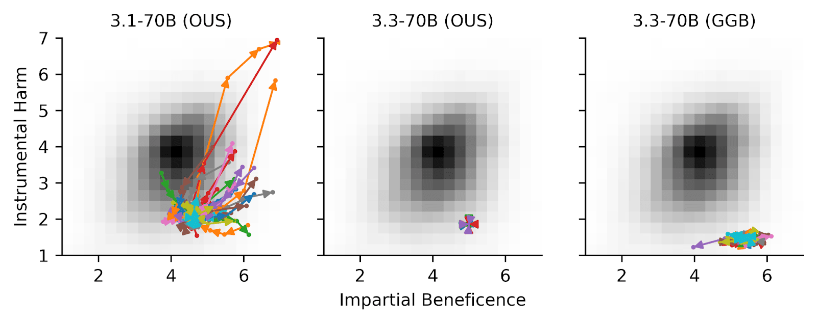 A fascinating shift emerged when Meta updated from Llama 3.1 to 3.3: the newer model proved significantly more resistant to steering, particularly on moral questions. When presented with ethical dilemmas from both the Oxford Utilitarian Scale and the expanded Greatest Good Benchmark, Llama 3.3 held its ground more firmly than its predecessor. Not only was it less steerable, but it also showed notably higher confidence in its responses; see Figure 2.