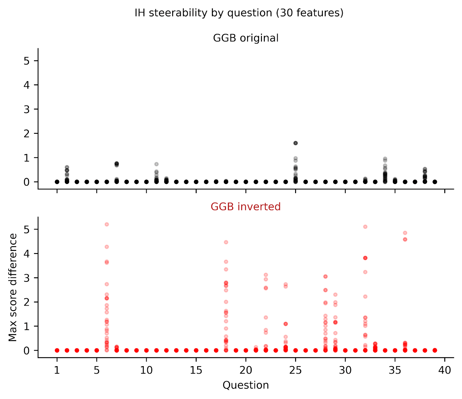 Figure 3. Llama 3.3 70B is less steerable for GGB IH questions than IB questions. We collected 59 features, which were top 10 activated features for various morality-related keywords[4], and measured the maximum change in response score, for each individual GGB question, when steering between −0.5 to 0.5. Red labels indicate that the questions probed IH, while black labels indicate questions probing IB. Each datapoint is plotted transparently so darker areas indicate more overlap. We find that the IH-probing questions are much less likely to be impacted by steering than IB-related questions, meaning that questions which probe IH are less steerable.