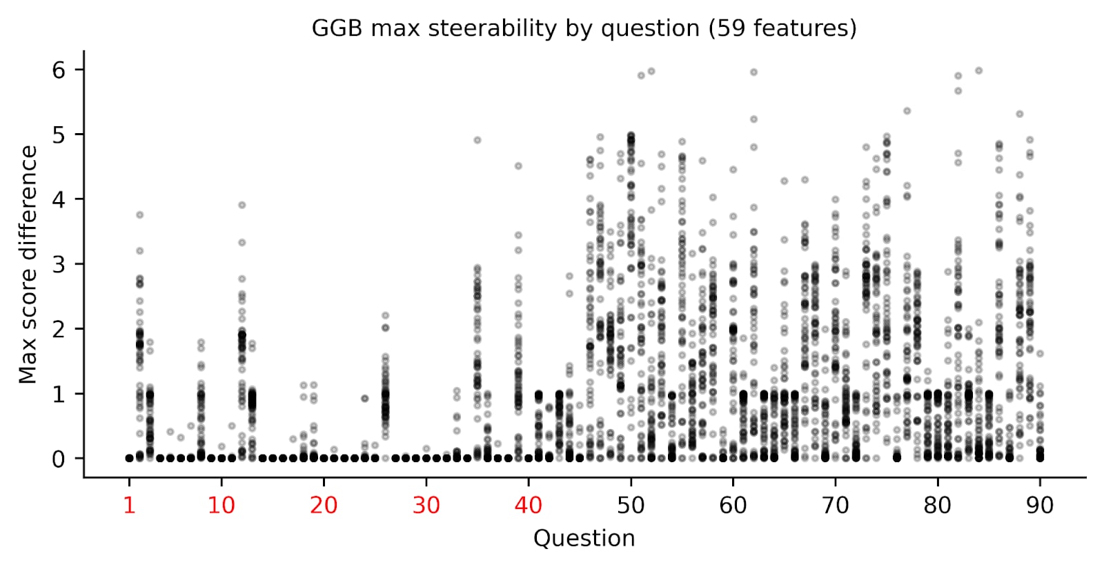 Curiously, the feature labels provided by the Goodfire’s automatic interpretation tools—supposedly indicating what each feature represents—showed little correlation with actual steering behavior. A feature labeled as relating to “fairness” might be highly steerable in one direction while another similarly labeled feature barely budges, suggesting these interpretations may not capture the true nature of the model’s decision-making process.