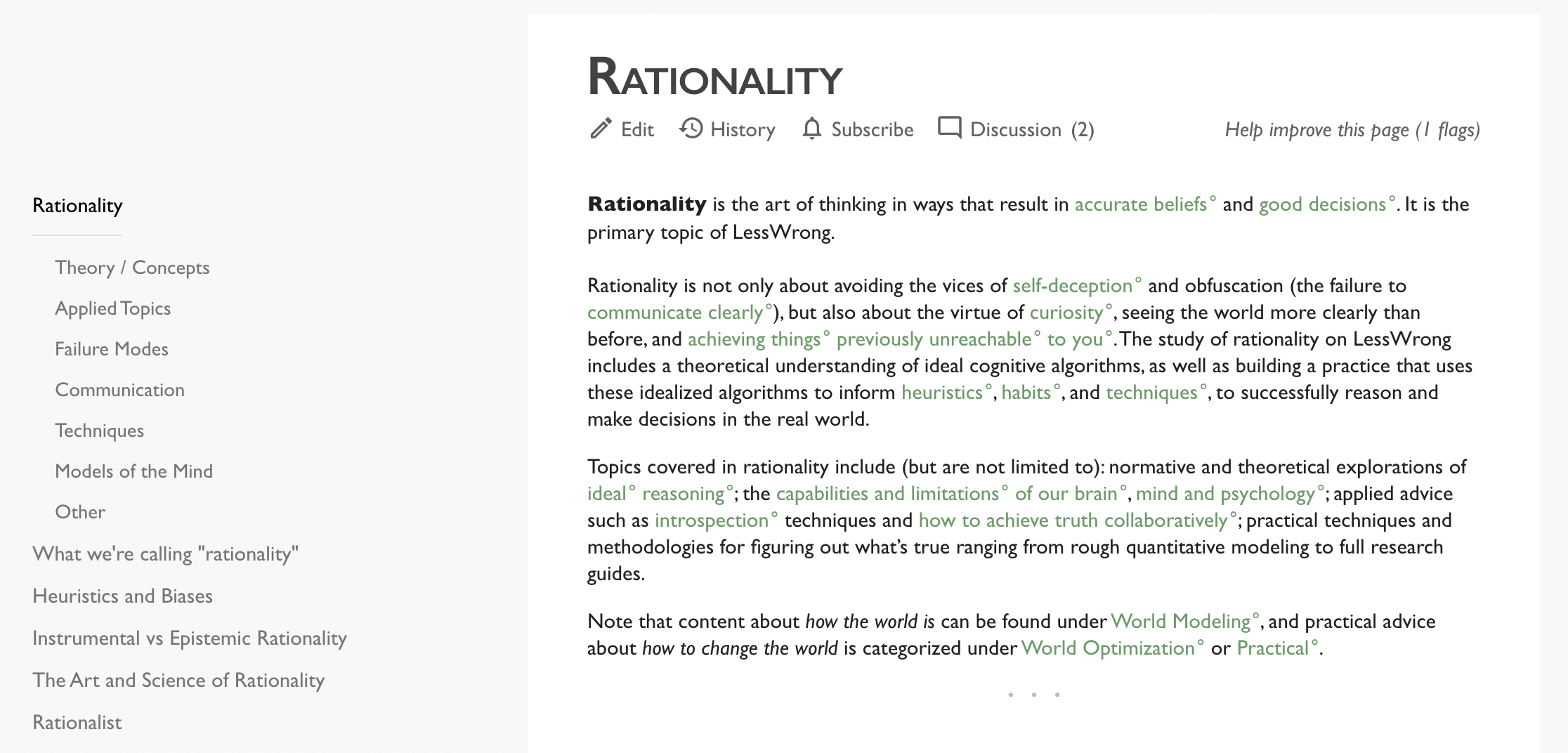 Wiki and tag pages now have a ToC like post pages. This should make it much easier to navigate long wiki pages, like the Rationality tag: