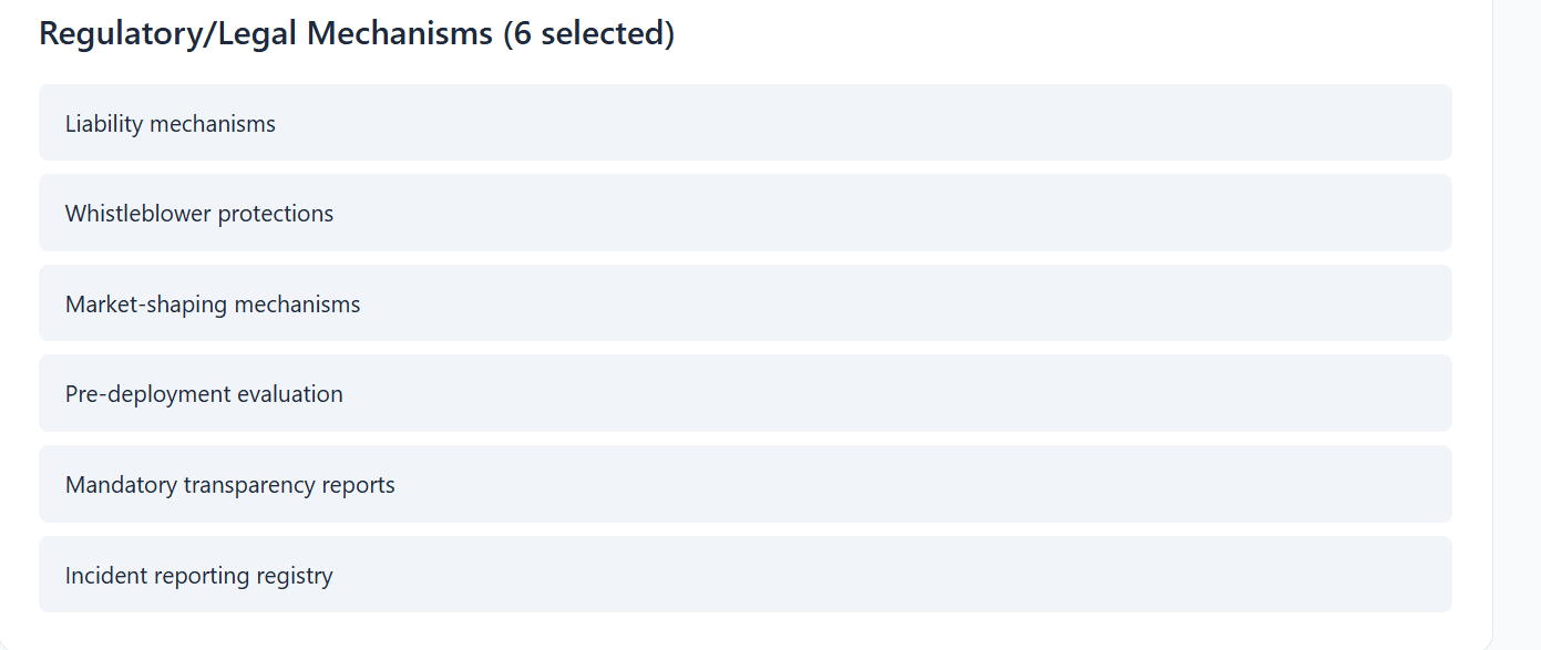 Try it out based on your own beliefs! If you believe that “if anyone builds it, everyone dies”, you’ll probably support a Global Moratorium. You can then choose Yudkowsky mode, pick and choose the concrete institutions and mechanisms that might save us (e.g. strong global institutions, strict regulations on model size and hardware-based restrictions).