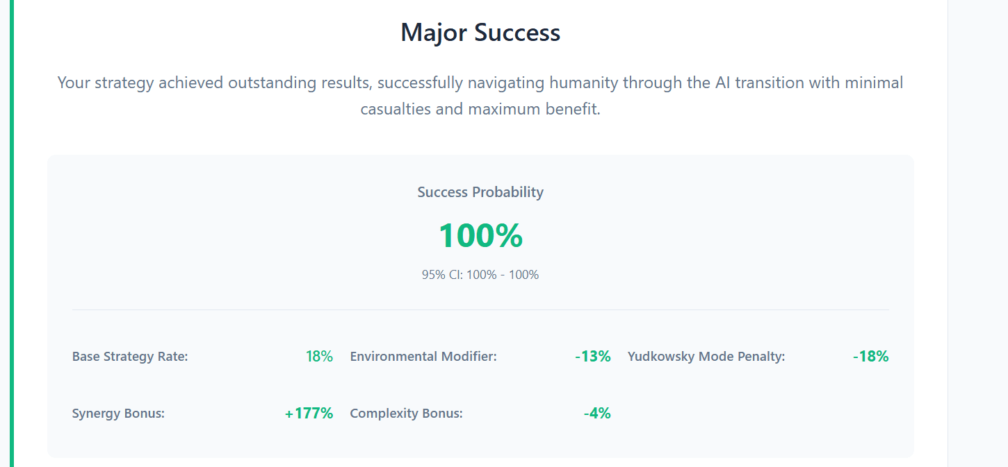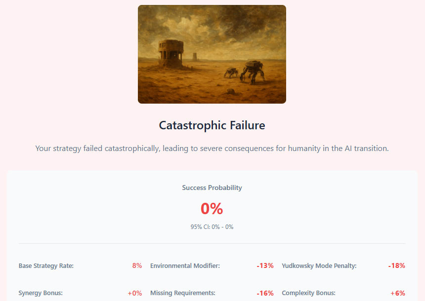 You then get an outcome for humanity. In the “Yudkowsky World” (doomer mode), my demo policy set scored 0% chance of success, and grimly ended in catastrophic failure. Can you do any better?