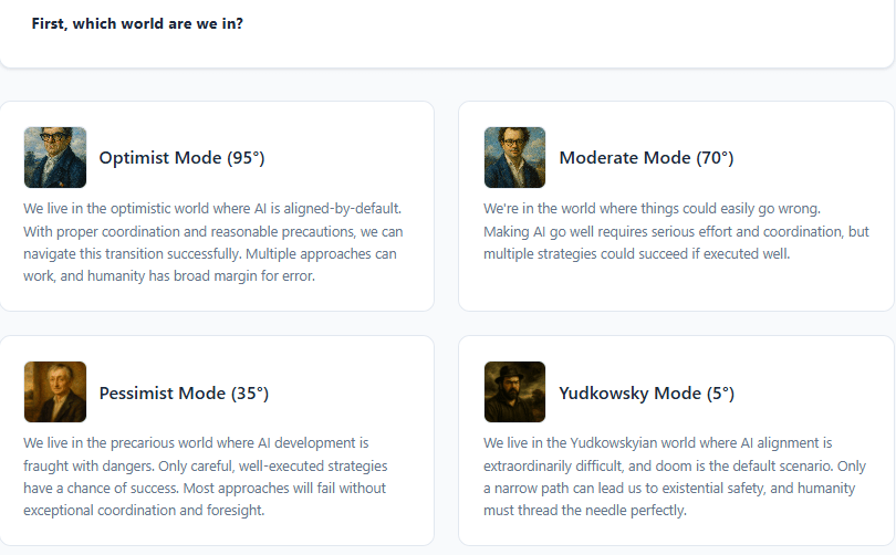 Choose your underlying worldview/difficulty (with beautiful pictures of famous AI figures)